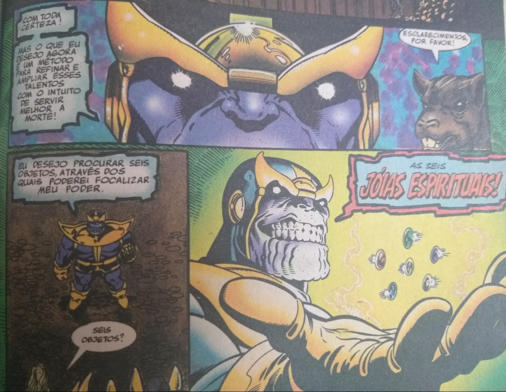 Thanos então sai pelo Cosmos, em busca de cada um dos seres cósmicos portadores de Joias Espirituais – até então, todas as gemas se chamavam assim, embora só a de Warlock fosse de fato “espiritual”. E os derrota um a um, não no braço, mas em ardis e diálogos sensacionais. E ao final de cada confronto, faz questão de humilhar cada um dos antigos portadores das Joias, ignorantes que compreendiam senão apenas uma minúscula fração do real poder da gema.