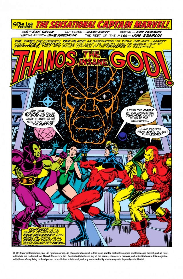 Hoje em dia parece impossível imaginar Thanos sem associá-lo imediatamente à Manopla do Infinito. Mas Thanos já tinha dado muito trabalho aos Vingadores muito antes de ter montado a Manopla pela primeira vez – o que acontece apenas em 1990, nesta “Thanos Quest”. Quando escrevia a série do herói kree Capitão Marvel, Starlin nos traz Thanos para enfrentar Mar-vell, Rick Jones e os Vingadores pelo poder do Cubo Cósmico – que nos quadrinhos não é uma das Joias do Infinito, e sim um artefato tecnológico genuinamente inventado no nosso planeta.