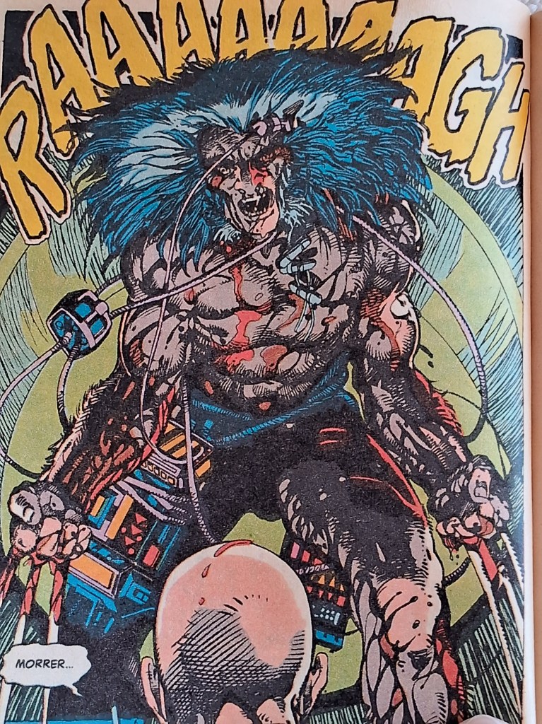 Mas se a sua arte genial ja nos é conhecida desde os primeiros arcos de Conan nos anos 70, o que é realmente surpreendente pra mim aqui é o texto de Windsor-Smith. Enxuto, modesto, preenchido de grunhidos, gemidos e silêncios de um Logan que fica 80% do tempo sedado, enquanto os outros apenas 3 personagens dialogam sobre o paciente diante deles, cobaia, animal, homem ou objeto, com intenções e (ausência de) limites éticos muito distintos.
