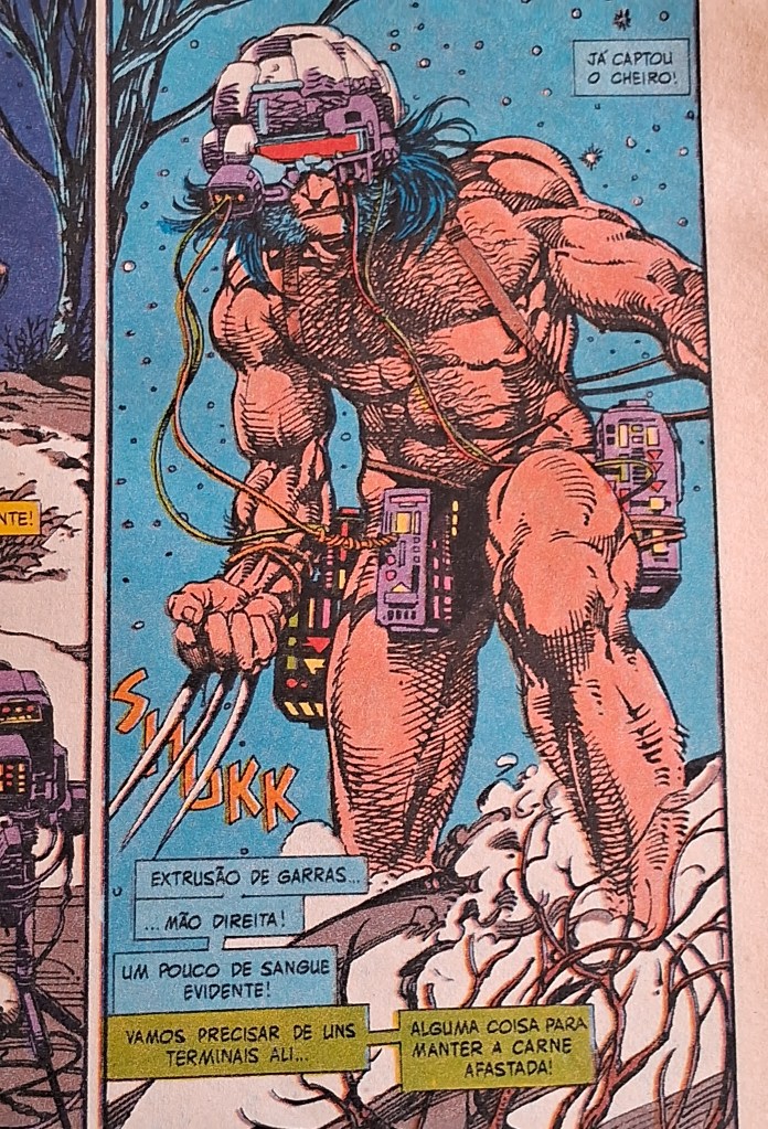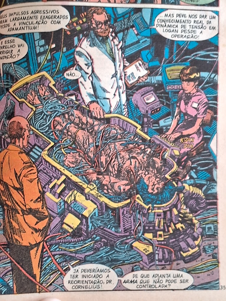 Já não tenho tanta certeza, mas acho que a primeira vez que se apresenta o esqueleto de Logan como algo totalmente artificial é na história Dias de um Futuro Esquecido, quando o velho Logan é incinerado por um robô Sentinela. John Byrne desenha então algo muito parecido com um T-800 fumegante – mas a revista dos X-Men é anterior ao filme, ok?
