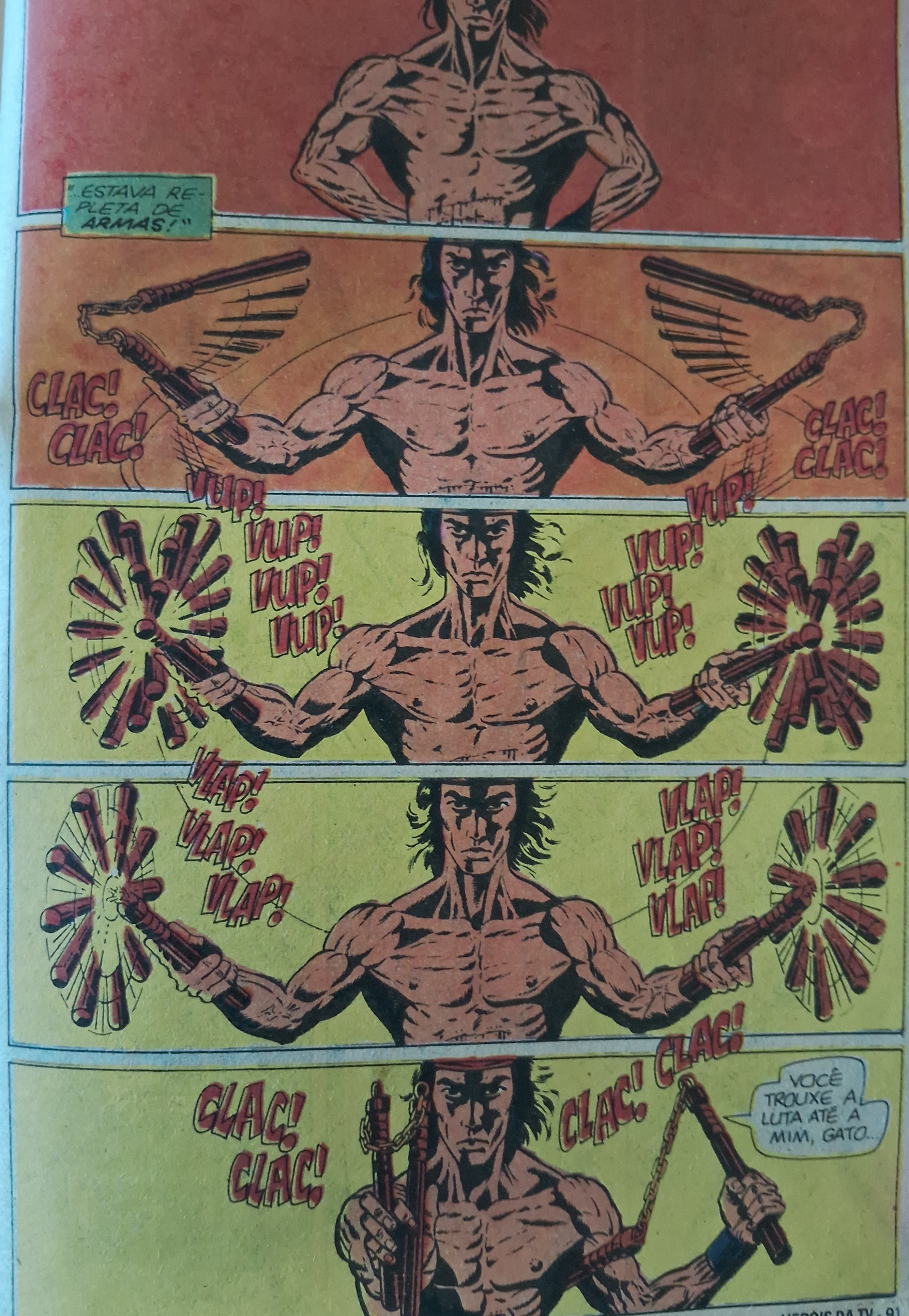 Foi o primeiro “arco longo” que li com esse entendimento – porque o normal nessa época era no máximo um “continua no próximo número”. Mas aqui, desde o início já ficava claro que seriam vários capítulos – e dava um ódio, porque a Abril resolveu publicá-los entrelaçados nas revistas Heróis da TV e Capitão América, de modo que era obrigatório comprar as duas revistas todo mês. A estratégia, ao menos comigo, deu supercerto: eu que já comprava a Heróis da TV e não comprava a do Capitão, passei a comprá-la também por causa das histórias de Shang Chi e sua trupe do MI-6.