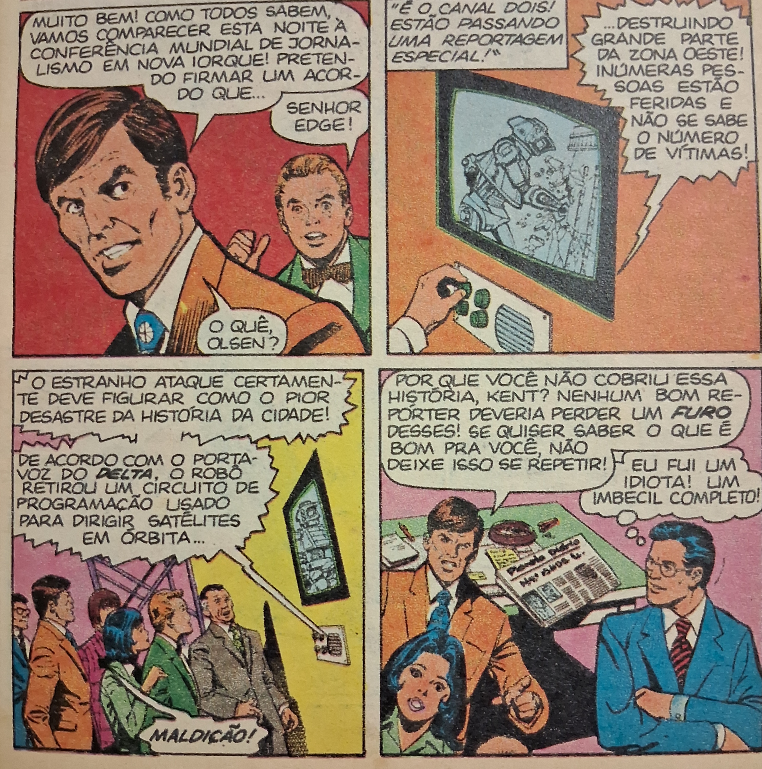 Encontramos Clark e Lois – aqui ainda chamada de Miriam Lane, como nas traduções antigas – não na redação do Planeta Diário, mas nos confusos e estressados estúdios da Rede Galáxia de televisão. O magnata Morgan Edge é um chefe muito menos carismático do que Perry White, e realmente não lembro se esta tentativa de “atualizar” o ofício repórter de Clark era legal – nunca fui um grande leitor do azulão caipira. Acho que a única coisa que eu achava interessante nesta fase é que Lana Lang ressurge pra tirar o conforto da Lois, mas nem tenho certeza se era nessa época mesmo.
