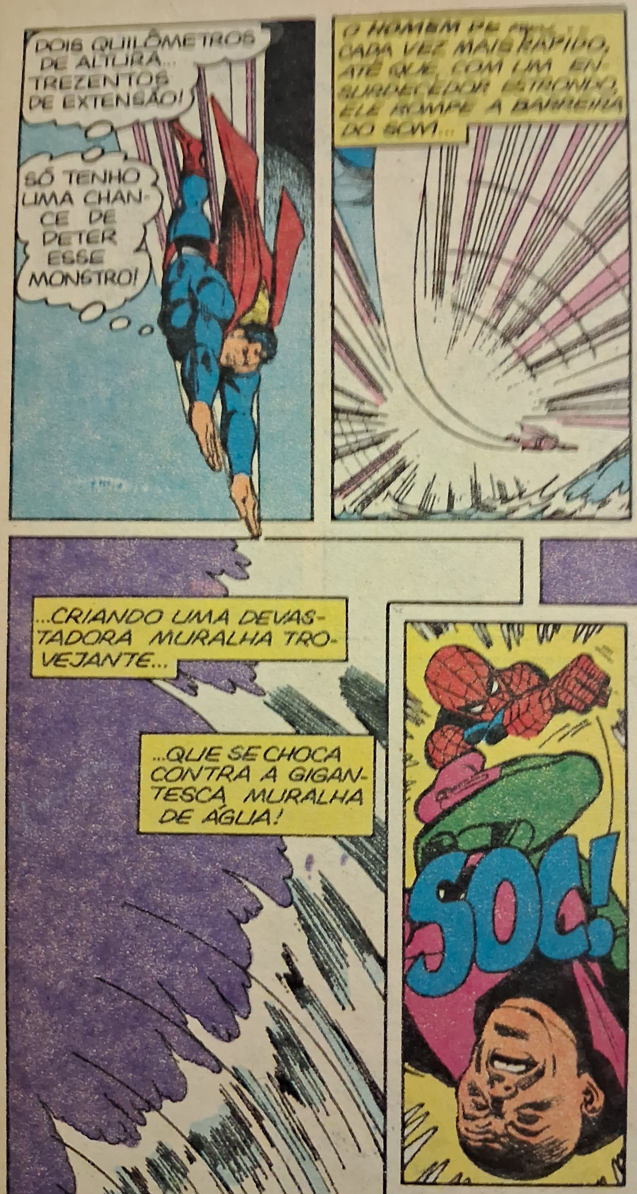 Enfim, algumas cenas de luta, Octopus perde o óculos, Super usa judô para derrubá-lo, enquanto isso Luthor aperta lá o botão, criando um tsunami que vai varrer a costa leste do EUA. O Super finalmente resolve se dedicar um pouco mais no serviço, e sai voando em supervelocidade de volta à Terra para tentar parar o tsunami no braço. O Aranha fica sozinho no satélite segurando as pontas, mas então Dr. Octopus, que não tem vocação pra vilão genocida, fica apavorado com o verdadeiro objetivo dos planos de Luthor, e resolve ajudar o Aranha a enfrentá-lo.