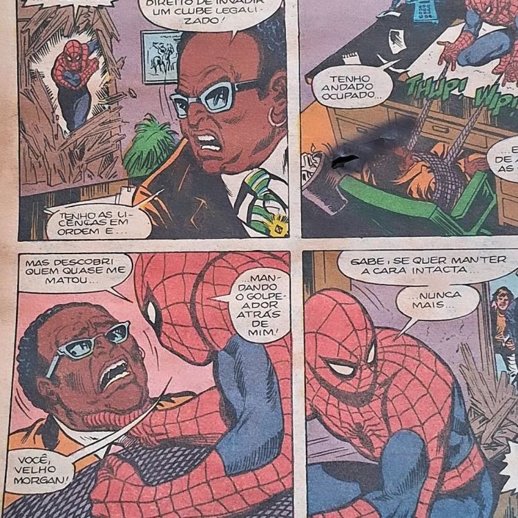 Vemos ainda o Aranha dar uma dura no gangster Morgan, um dos vários chefões do crime que operavam caoticamente antes de Wilson Fisk voltar do Japão e organizar a bagaça.